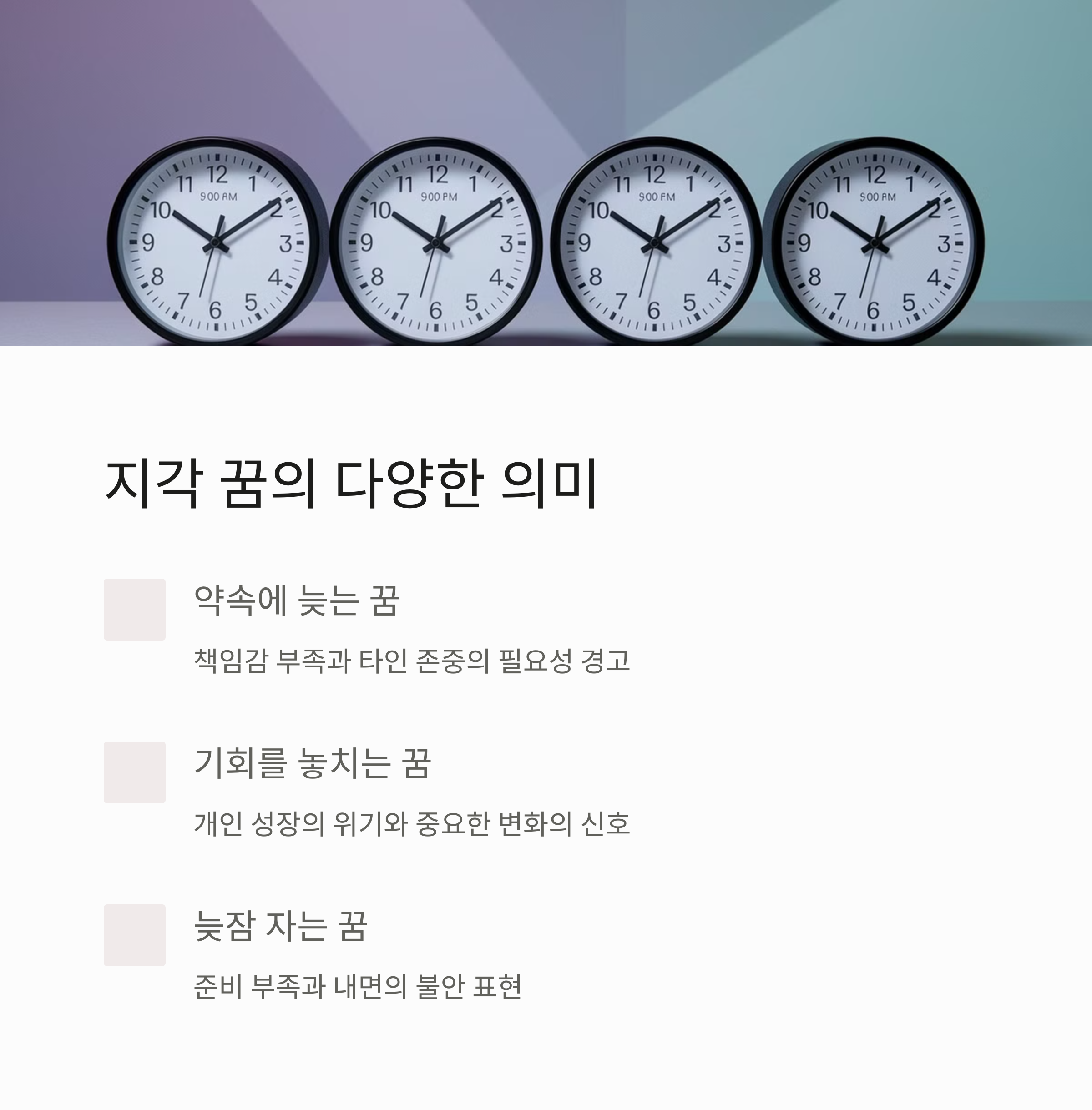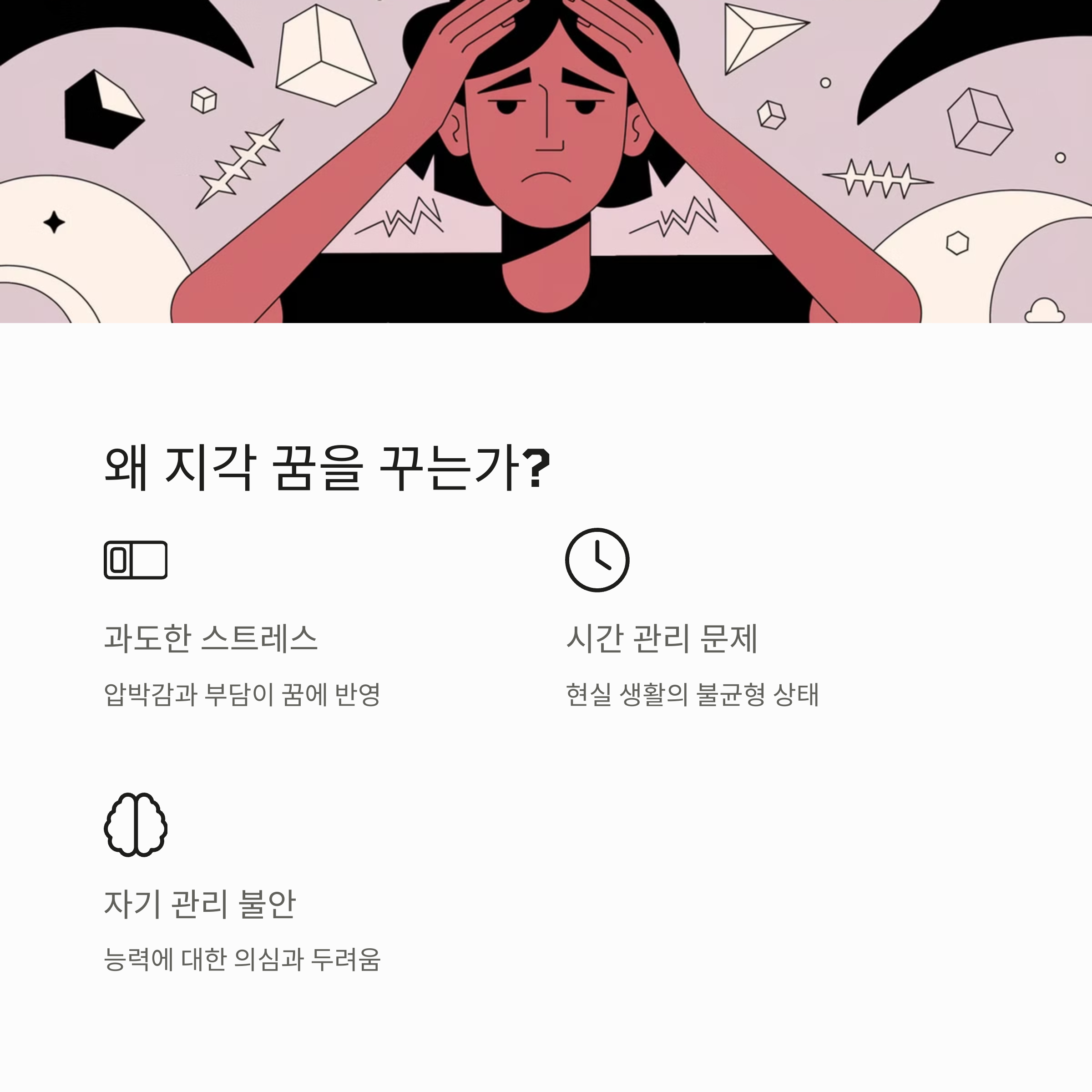 | 늦잠 꿈 | 준비 부족과 불안감 | 시간 관리 문제 | 스케줄 조율 및 스트레스 완화 |