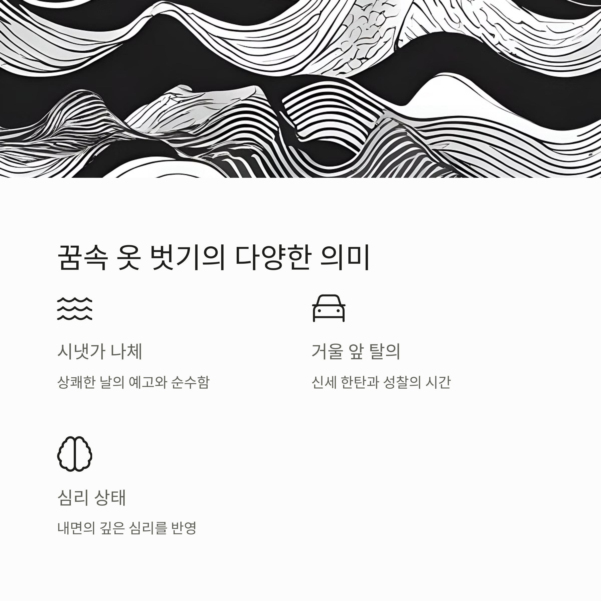 옷을 벗는 꿈은 주로 자신의 내면과 상황에 대한 갈망을 표현하는 이미지로 해석됩니다. 꿈에서 상황별로 느껴지는 감정과 행동에 따라 의미가 크게 달라지며, 예컨대 옷을 자발적으로 벗는 꿈은 긍정적 변화의 가능성을 나타낼 수 있습니다. 반대로 누군가가 강제로 옷을 벗기면 불안이나 수치심과 같은 부정적 감정 상태를 반영하기도 합니다. 특히 꿈에서 사람들 앞에서 나체로 있는 장면은 타인과의 관계 긴장 또는 자신의 취약함을 의미할 수도 있습니다.