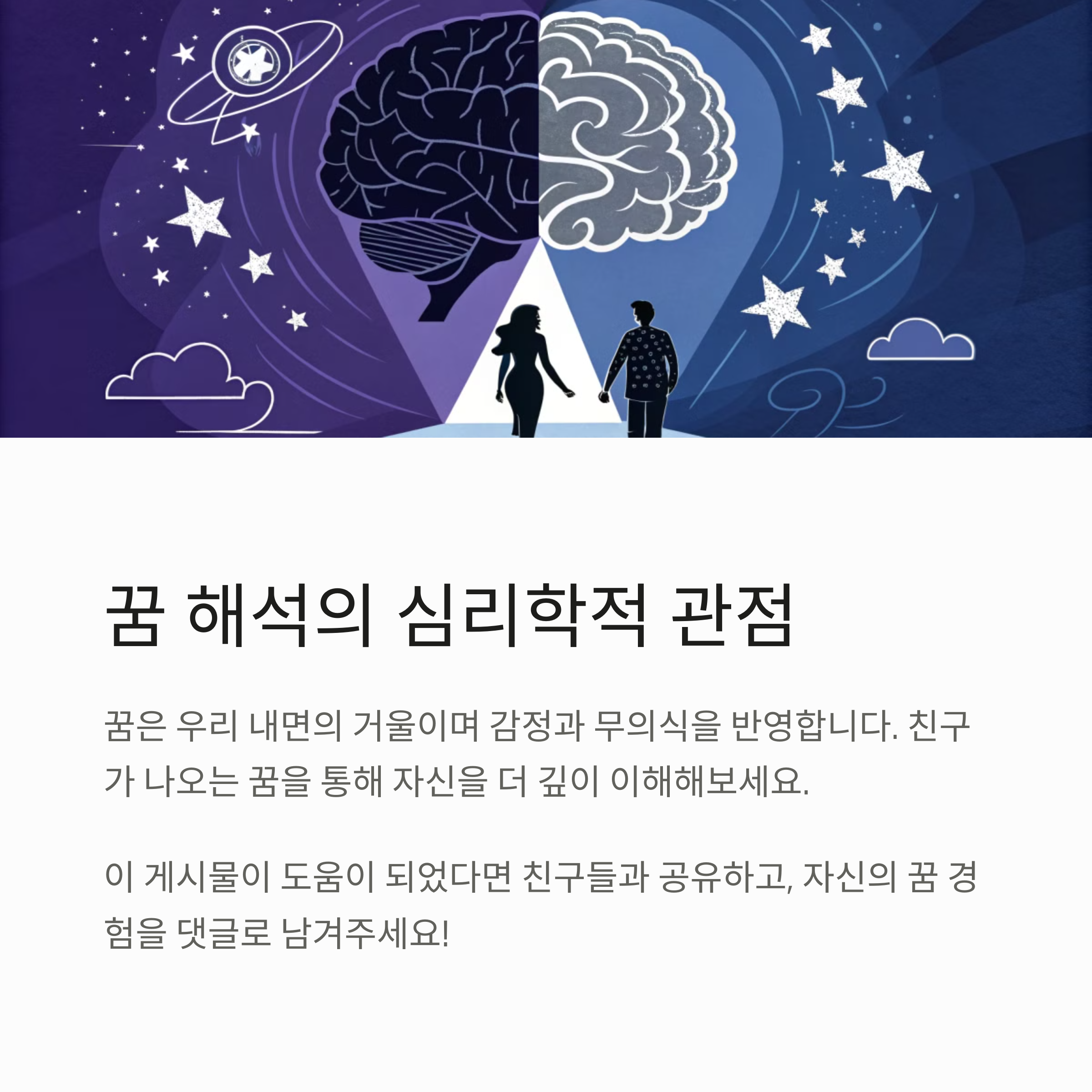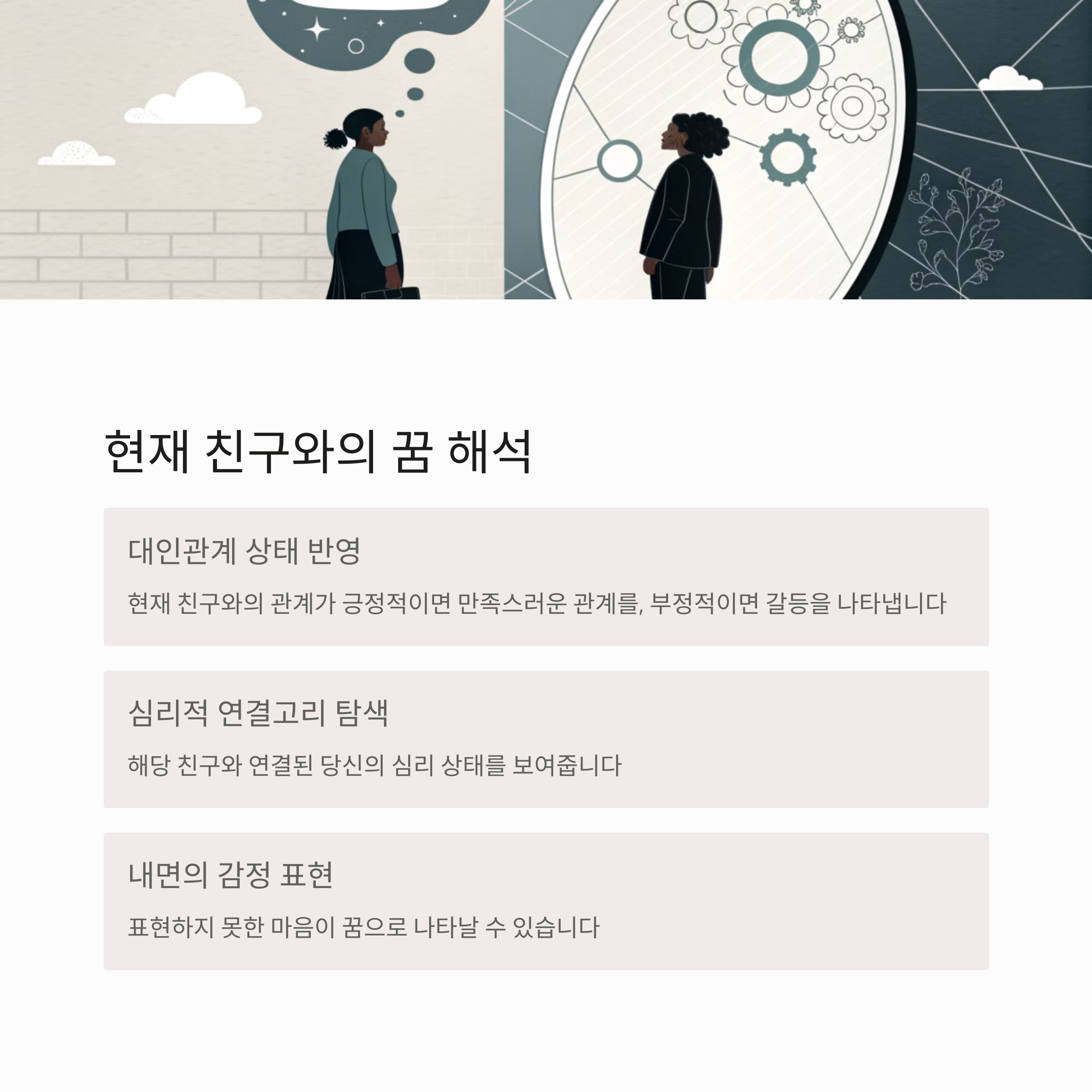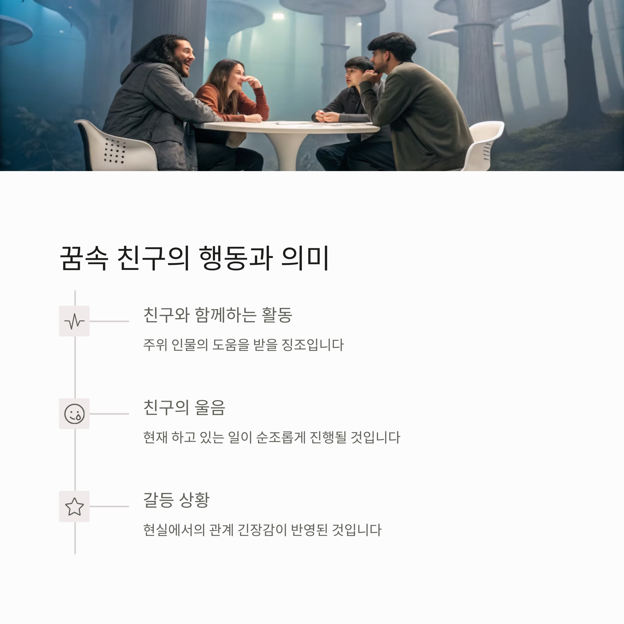 친구가 나오는 꿈은 심리적 상태와 현재의 관계를 분석하는 데 도움을 줍니다. 꿈에 등장한 친구가 어떤 상황에서 어떤 역할을 했느냐에 따라 현실에서의 인사이트를 얻을 수 있습니다. 이를 통해 현재의 관계를 돌아보고 개선하거나, 숨겨진 메시지를 파악할 수도 있습니다.
